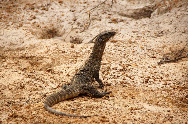 Wir fahren aber nun, wie gesagt, nach Osten zunächst entlang der Gibb river road, aber nur die ersten ca 100 km, die auch schon seit einigen Jahren geteert sind. Sobald wir am Lennard river ankommen wir die Strasse zu einem track. Hier biegen wir nun nach Süden ab und campen im Bandilngan NP, bei Sonnenuntergang besuchen wir die Windjana Gorge. Der Lennard river hat hier eine wunderbare Schlucht gestaltet. Viel interessanter sind jedoch die ca 100 Meter hohen Wände der Schlucht – ursprünglich waren diese Wände ein Korallenriff, welches im Devonzeitalter (also vor mehr als 300 Millionen Jahren) von Wasser bedeckt waren. Man findet heute noch den Wänden entlang Fossilien devonischer Meerestiere. Der Fluss fliesst nicht während der Trockenzeit, aber aktuell ist doch viel Wasser in den Wasserlöcher zu sehen. Interessanterweise leben hier auch die sogenannten Frischwasser-Krokodile: die freshies. Diese gelten in Australien als für den Menschen harmlose Krokodile – dies ganz im Gegensatz zu den salties – den grossen Krokodilen, die durchaus fähig sind einen Menschen zu tilgen.