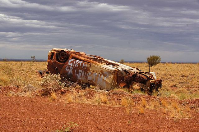 Nach dem Aufstehen und einem gemütlichen Kaffee und Frühstück sind wir losgezottelt, plötzlich haben wir auf der Gegenseite ein Auto gesehen und die Fahrer haben uns angehalten und gefragt, ob wir helfen können. Sie mussten das Auto aufbocken und das Rad anschauen. Es sah für uns etwas abenteuerlich aus. Die zwei Aboriginals, ein Junger Mann und ein etwas älterer Mann haben sich aber sehr gekonnt hingesetzt, das Problem angeschaut, und sich sofort an die Problemlösung gesetzt. Beide Vorderräder wurden abmontiert, die 3 von den 6 Schrauben vom rechten Rad abgenommen und auf die linke Seite überführt. Dass die Bremsflüssigkeit auf der rechten Seite nun undicht war, scheint nebensächlich gewesen zu sein. Ich habe versucht den älteren Mann zu fragen, ob es nun wirklich sicher sei weiter zu fahren. Er meint: «ja», 100% sicher. Na, gut! Wir hatten unsere Dinge noch nicht fertig eingepackt, schon sind sie in einem Affenzahn losgefahren. Wir haben sie nur noch von hinten gesehen.